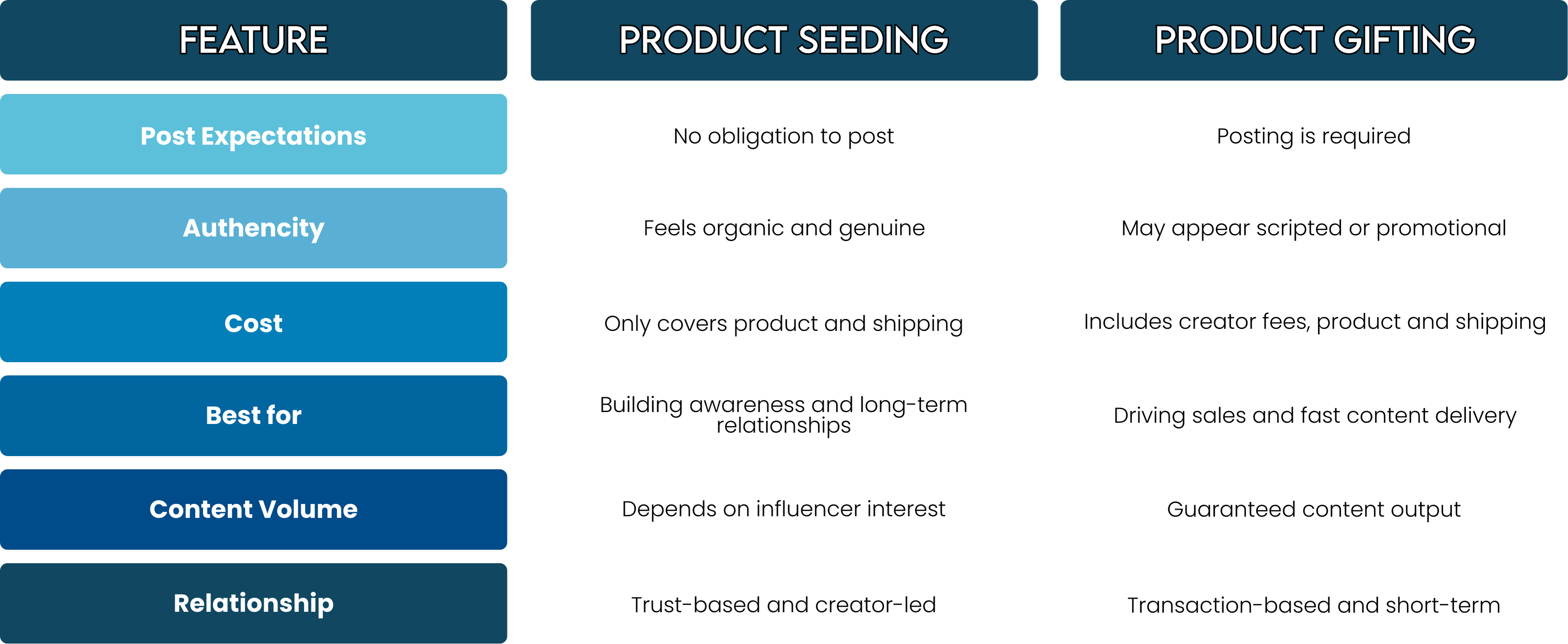 Product seeding is a no-strings-attached approach where you send products without expecting a post in return. Product gifting usually comes with the expectation that the influencer will share content.